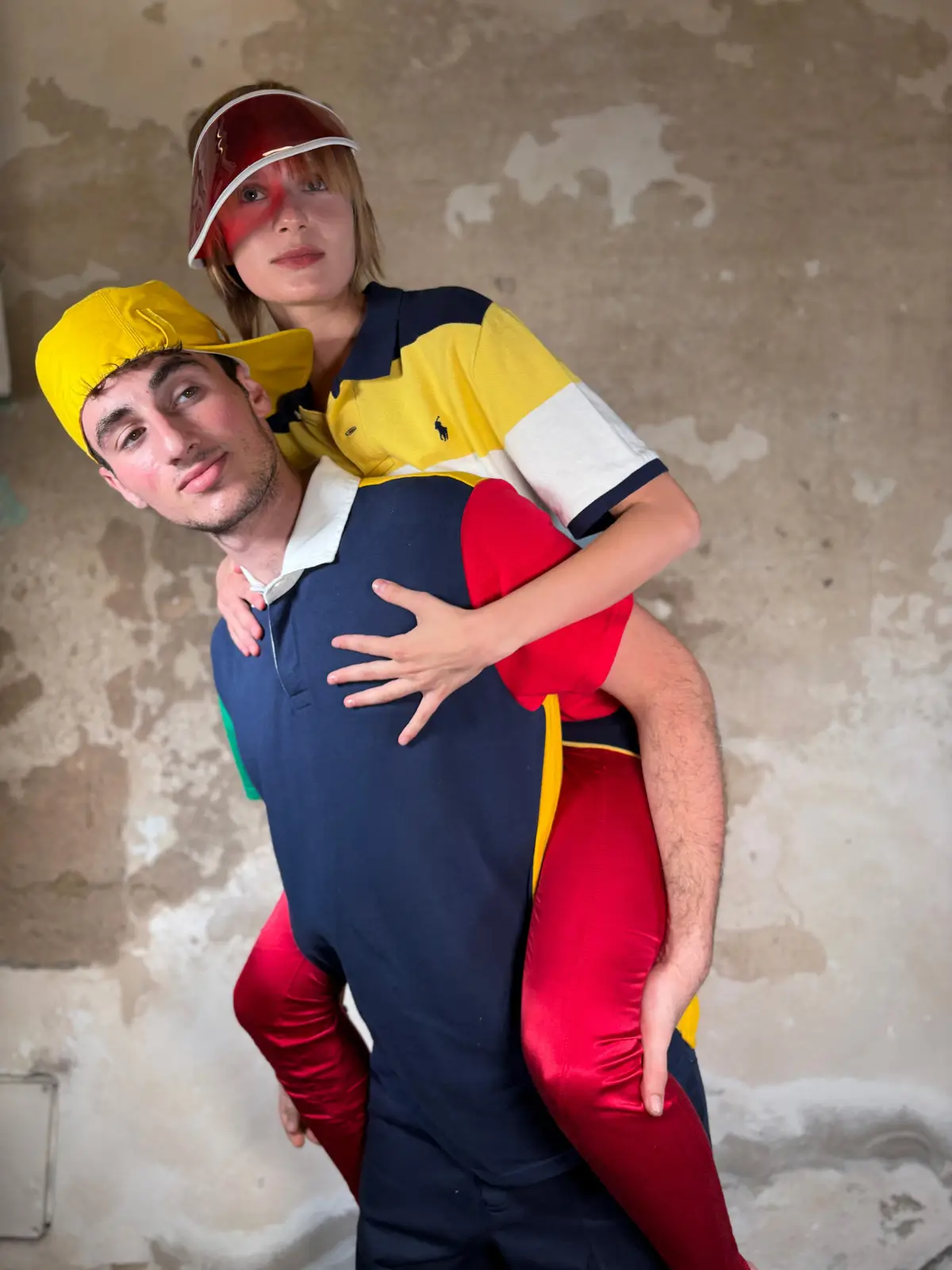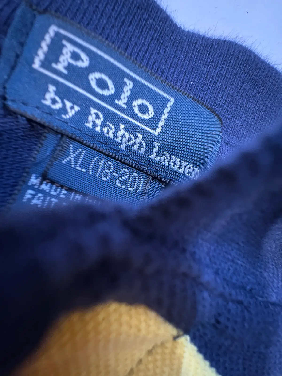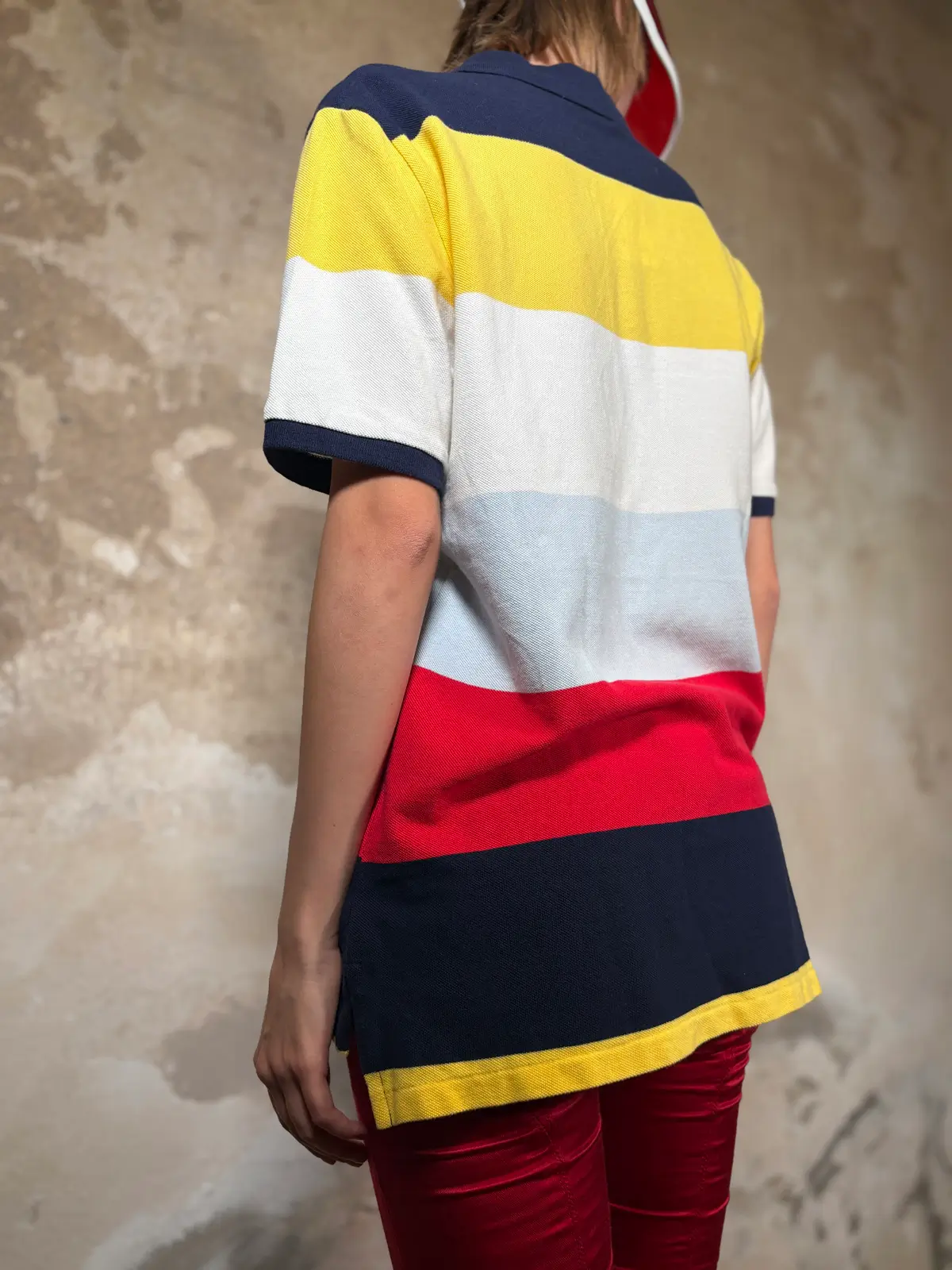 • Short-sleeved polo shirt with multicolored horizontal stripes.