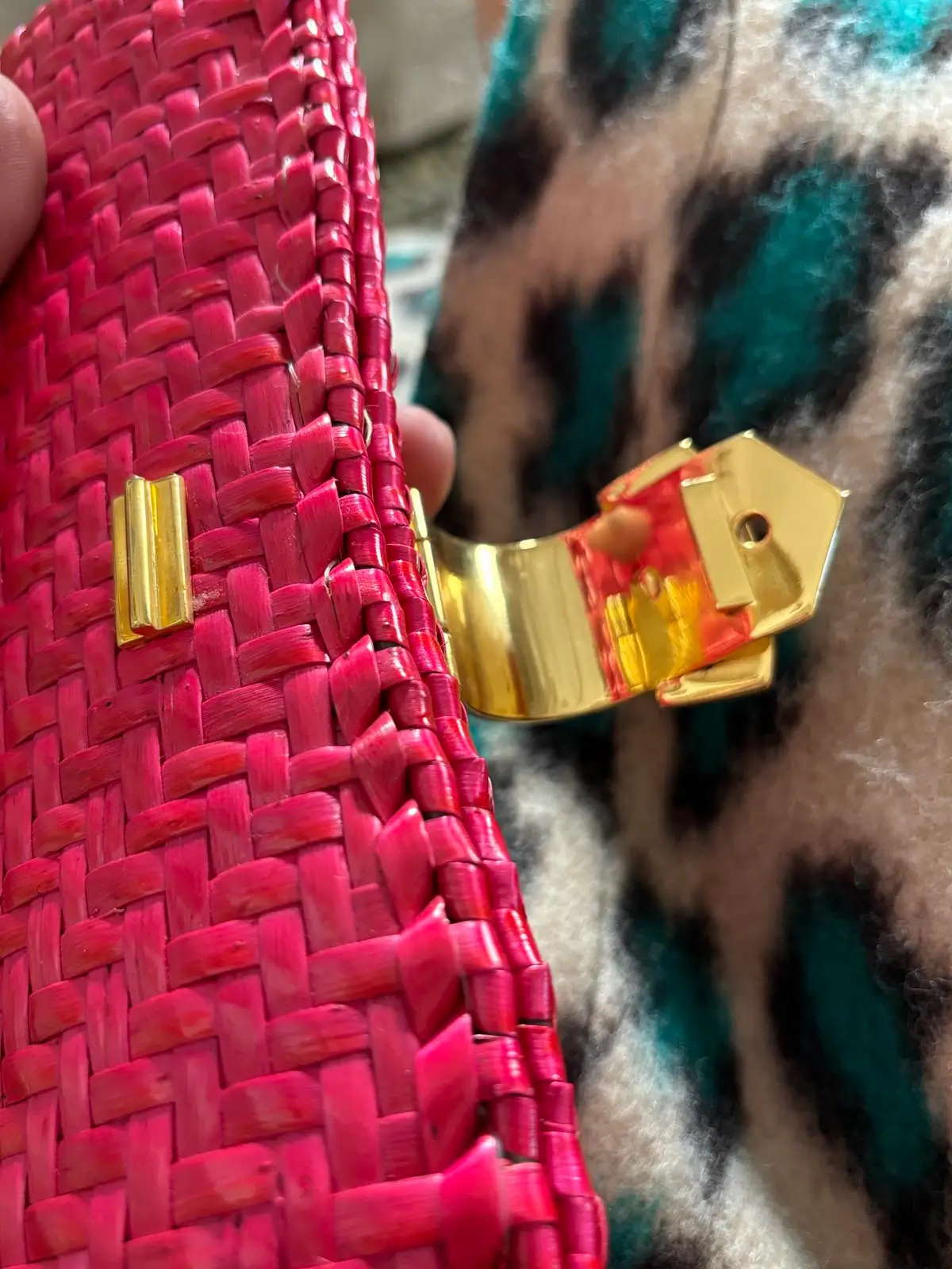 • Red wicker clutch with gold metal buckle closure.